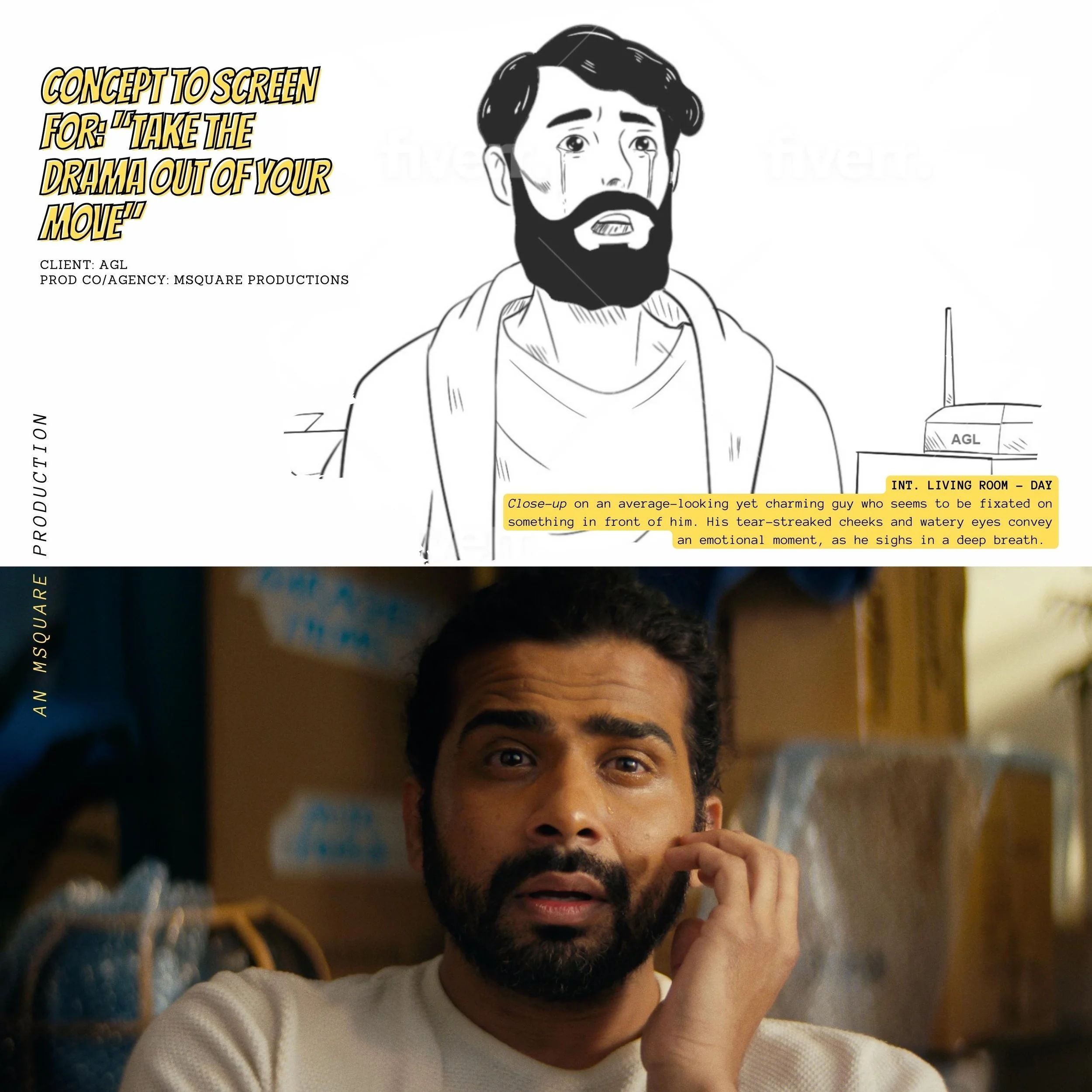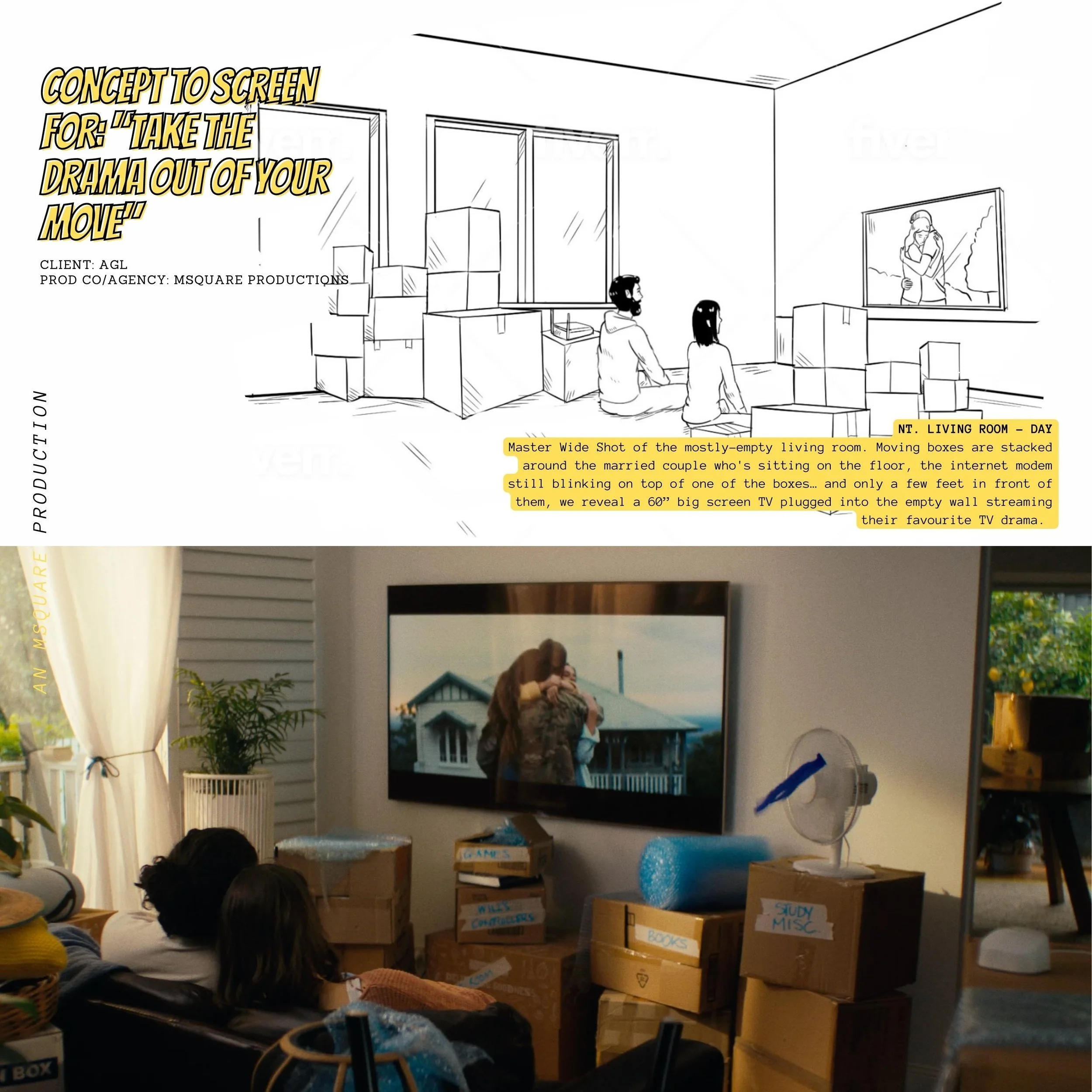 MSQUARE proposed the idea “Take The Drama Out Of Your Move” – a concept that lives up to its name. The narrative is simple yet unexpected, featuring a husband and wife in the process of moving into their new home... but instead of being burdened by the stress, they make time to enjoy the process. They’re able to do this with AGL’s help, by moving into an empty home that already has power and internet. The film would be brief yet punchy, unexpected and memorable, delivering AGL’s key messaging without feeling forceful. The camera movement would be controlled via a dolly system, creating a sense of cinematic energy. The sound design and score would be a major audial component to drive the visuals forward, accentuating each moment that leads up to the climactic final reveal. The goal is to provide audiences with a captivating experience that creates genuine enthusiasm and desire to learn more about AGL’s energy and internet options. So why not go epic?